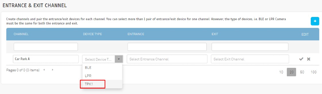 4. Assign TPK-1 into the Entrance and Exit channel by accessing the Parking Rule > Entrance & Exit Channel. Then, choose TPK on Device Type selection, and assign it as Entrance and Exit.