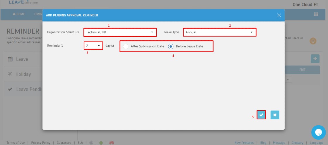 3. Select Organization structure > Leave Type > Reminder Days > After Submission Date / Before Leave Date > Click OK