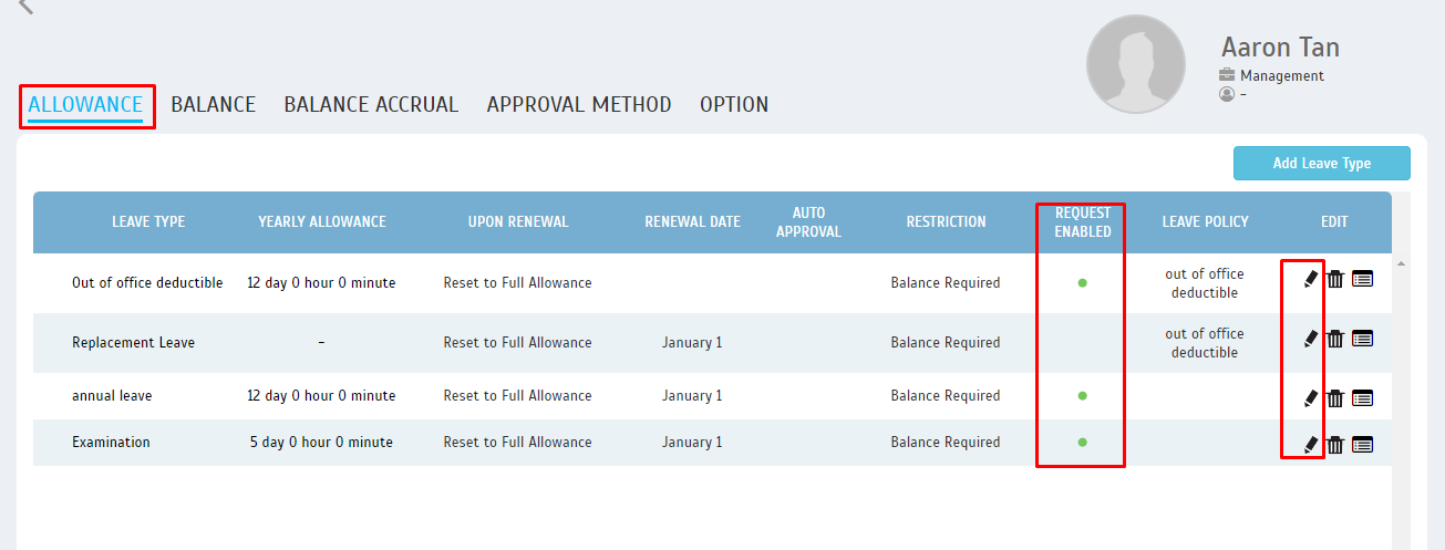 4. On the ‘Allowance’ tab, you can manage the leave type restriction.