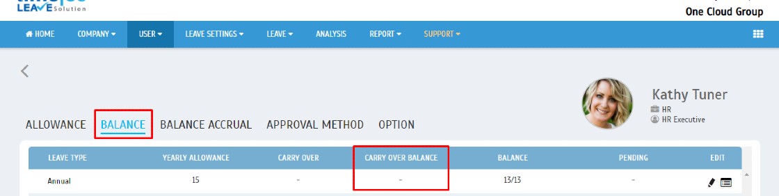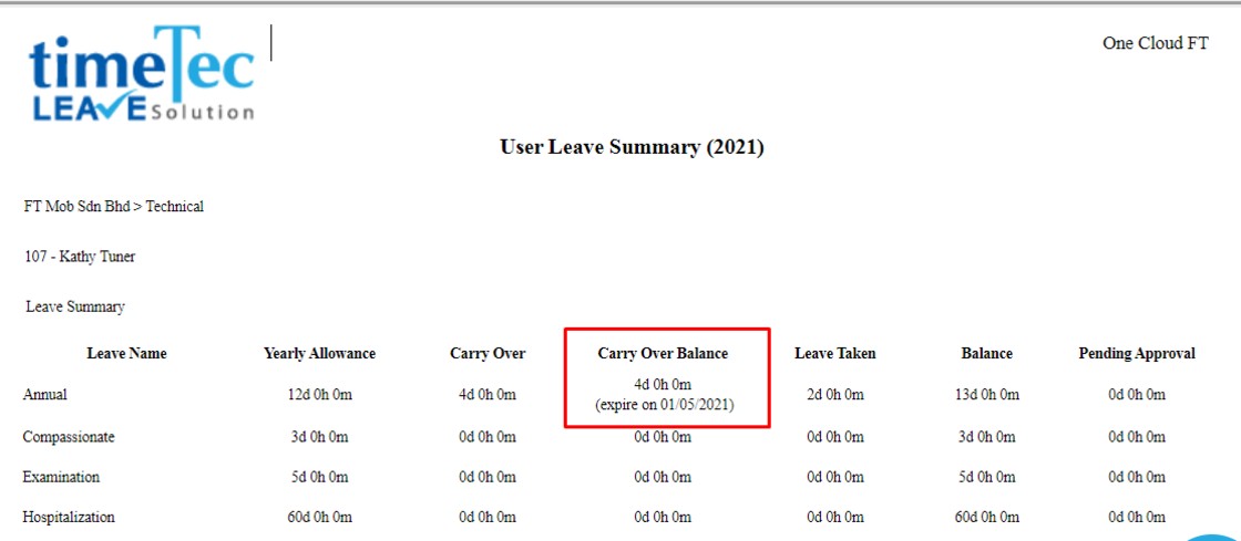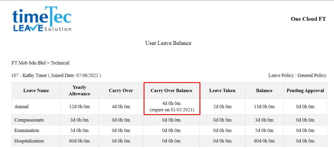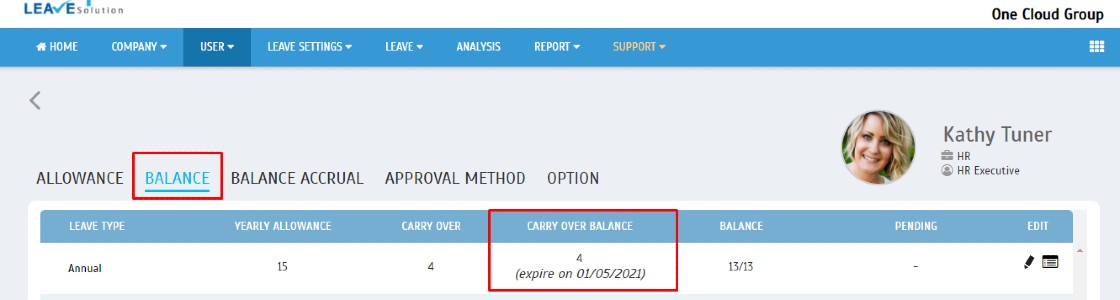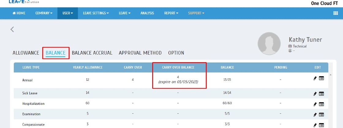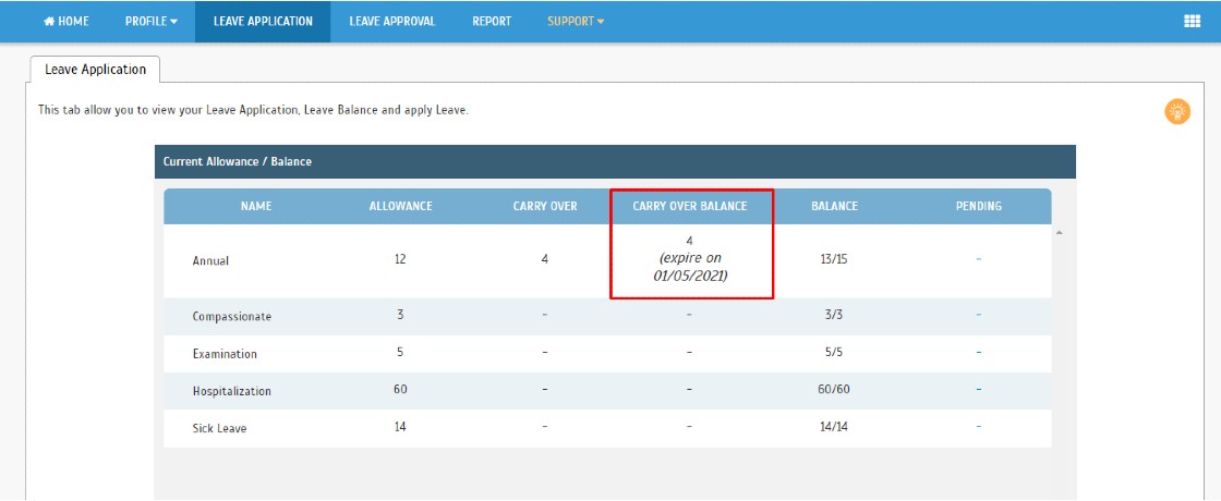 ii) Balance tab displays the carry over balance with an expiry date based on setting and last renewal.