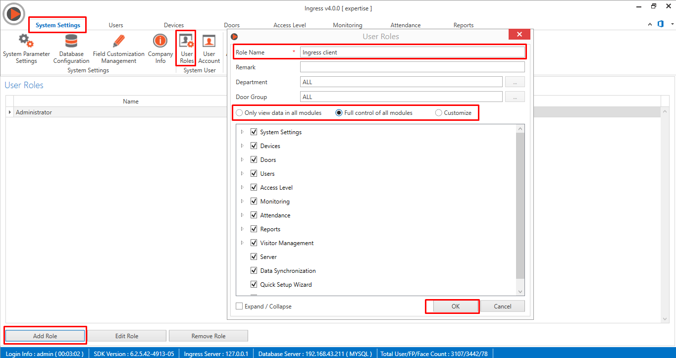 If you wish to log in to the Ingress client and Ingress server at the same time, you will need to create a different user account. Before you can create a login account for Ingress client, you will first have to create the user role. Go to System Setting > User Roles > Add Role > Role Name > Select which modules you want to allow to this role > Click OK