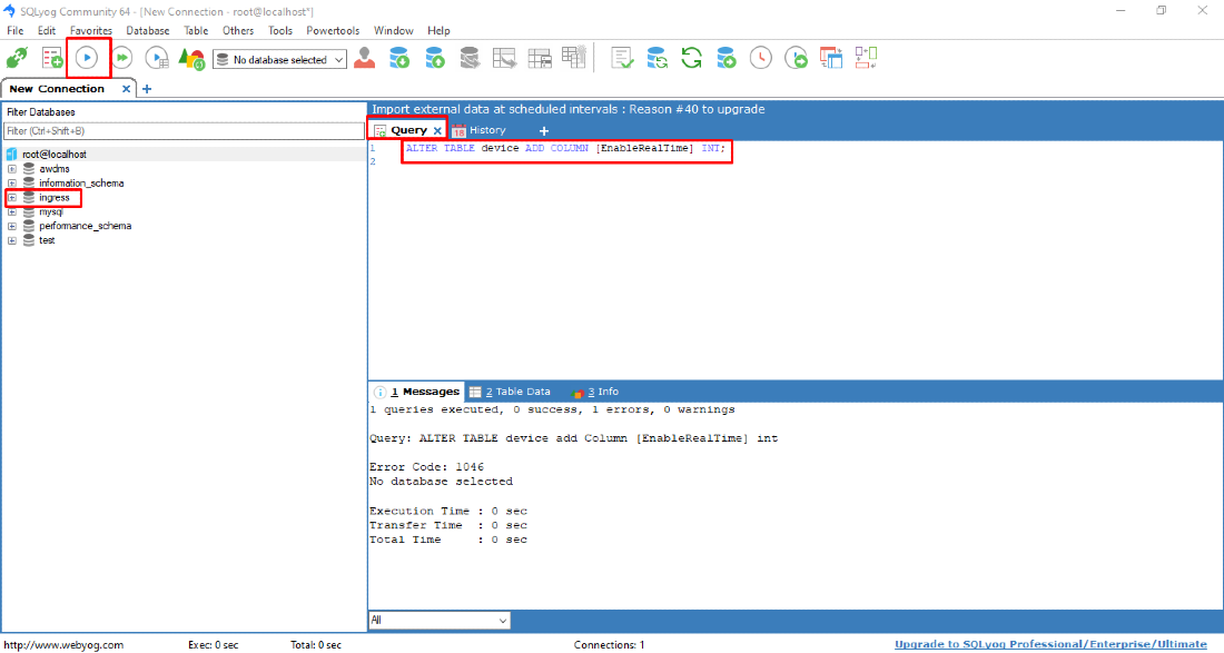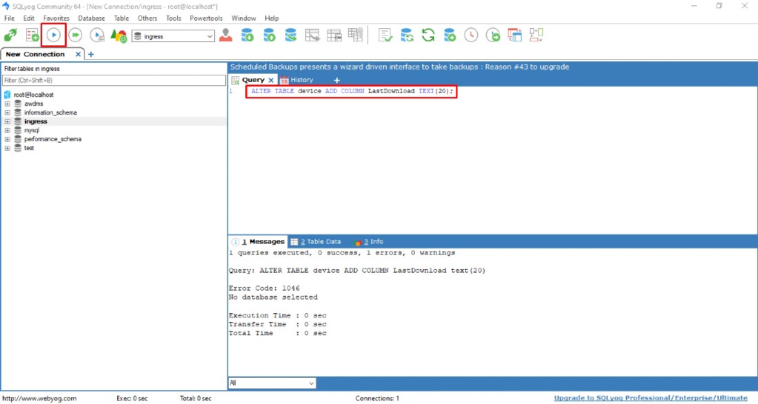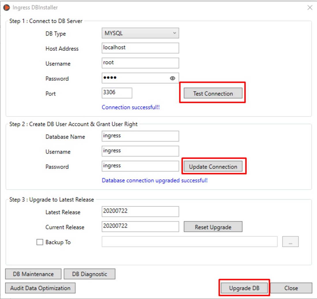 7. Then, you need to run Ingress DB Installer to upgrade the database after successfully running the query. Open Ingress DB Installer > Insert MYSQL password > Test Connection > Update Connection > Upgrade Database.
