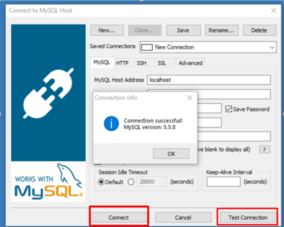 4. Click the New button and insert MYSQL password. After that click Test Connection to check whether the connection to the MYSQL database is successful or not. Then, click Connect.