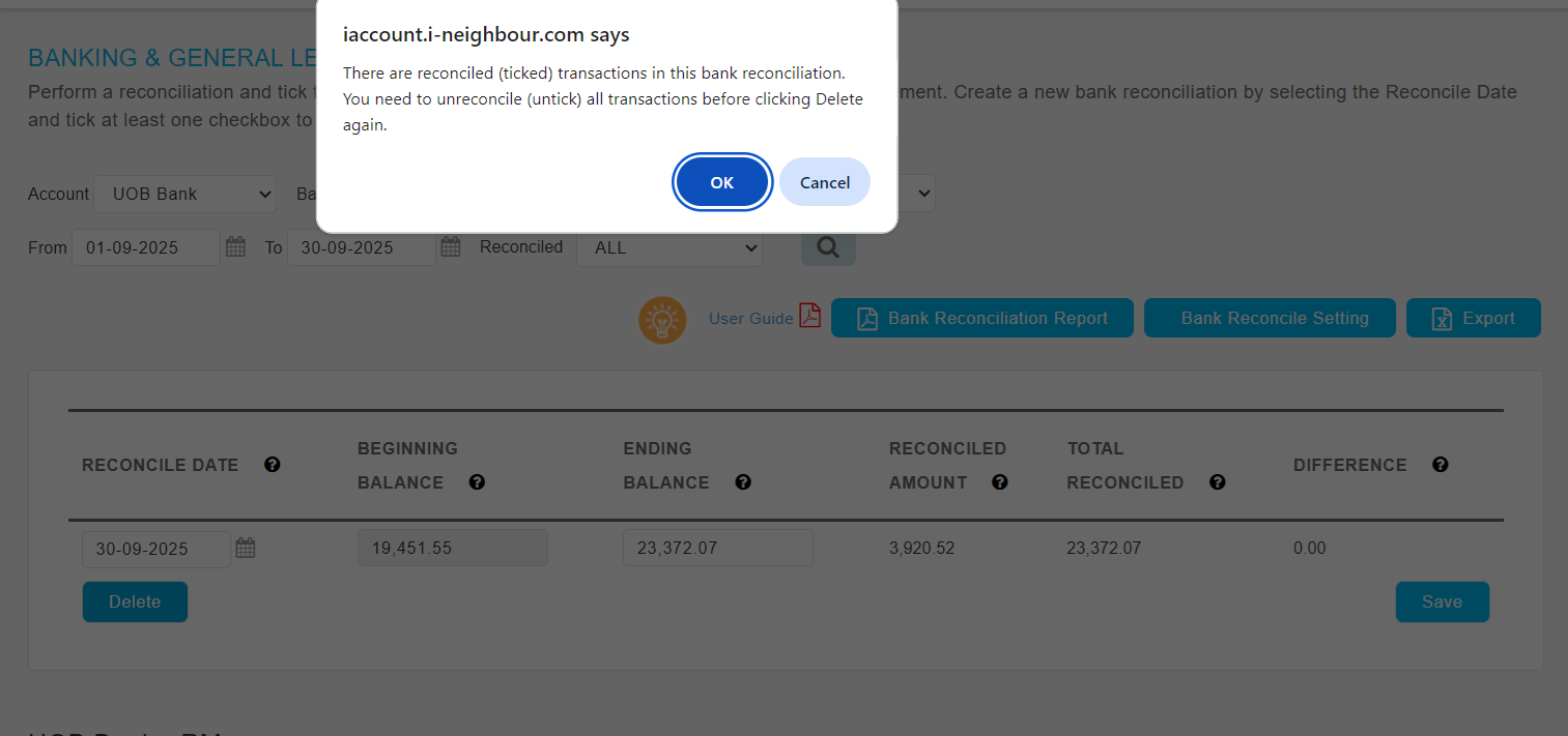 • Click the “Delete” button (located below Reconcile Date) – If there are no transactions ticked for this reconciliation, the system will allow you to delete it when you click Delete.