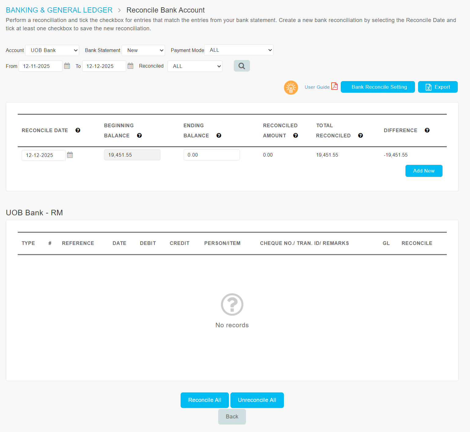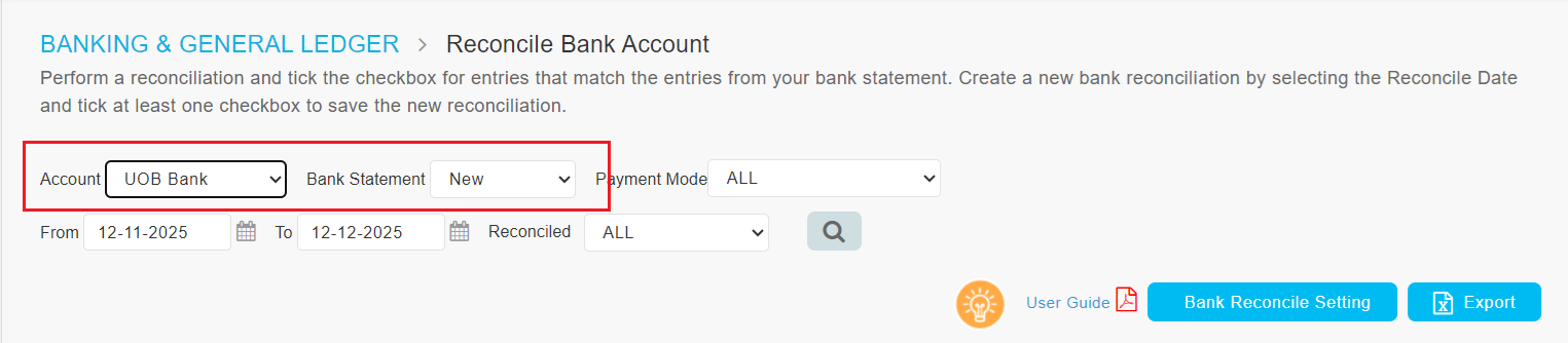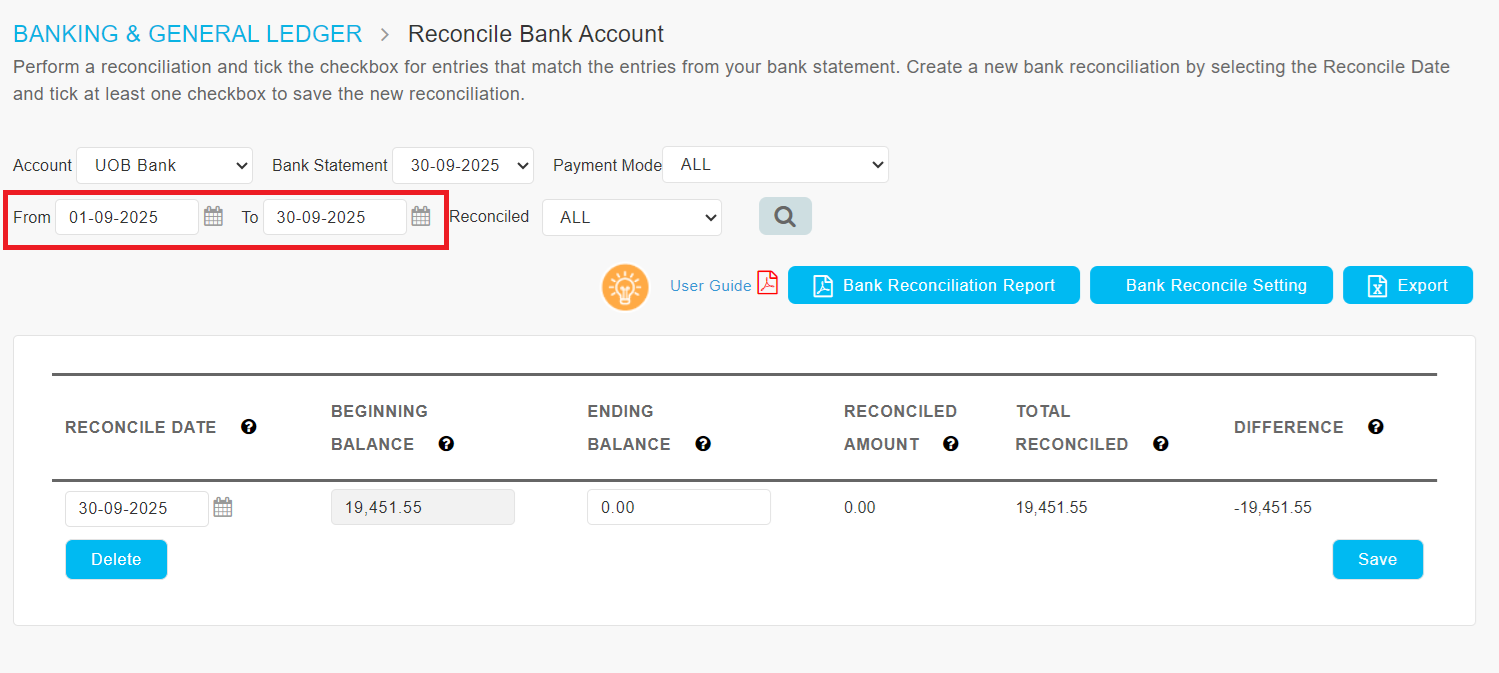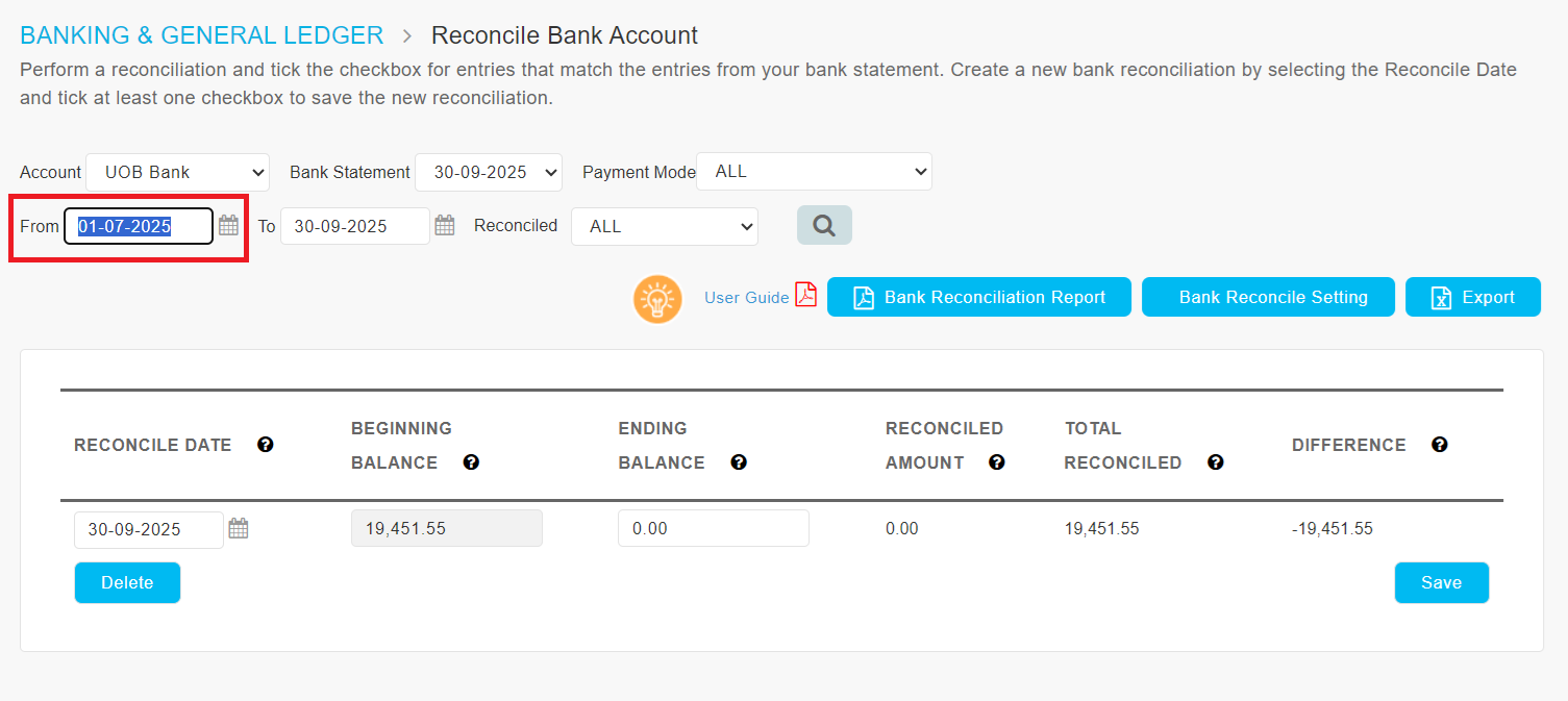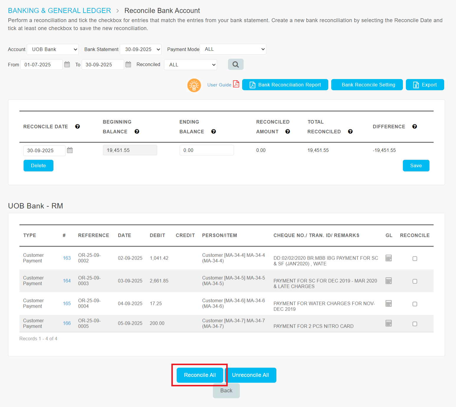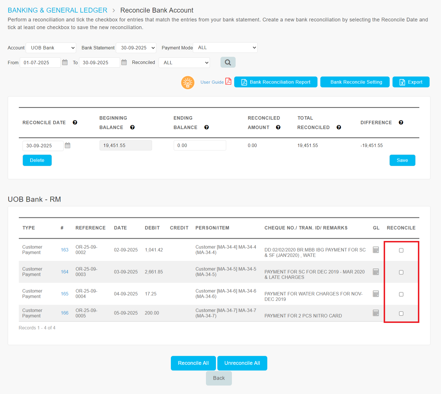 • If there are existing reconciled transactions, you have to first untick every checkbox (e.g. by clicking “Unreconcile All” button) under this reconciliation date. Extend the “From” date at the filter to ensure all previously reconciled transactions are covered.