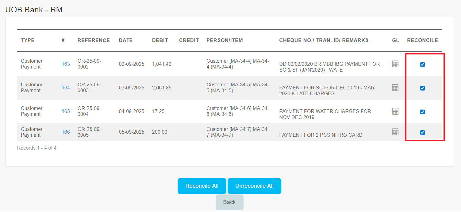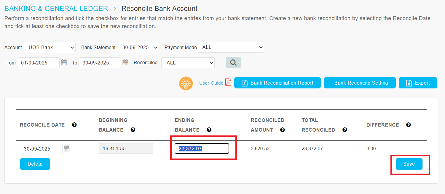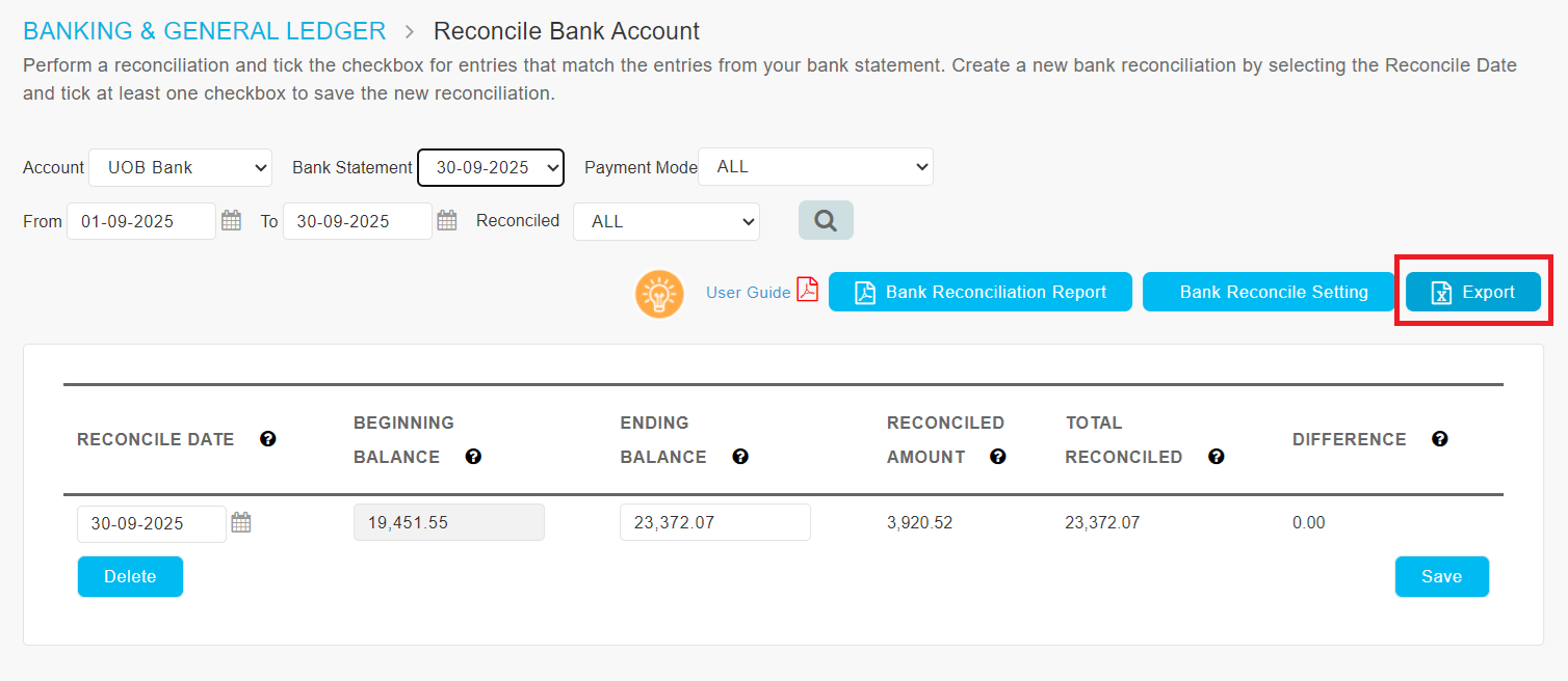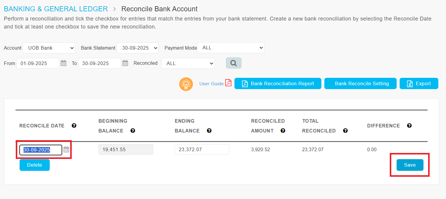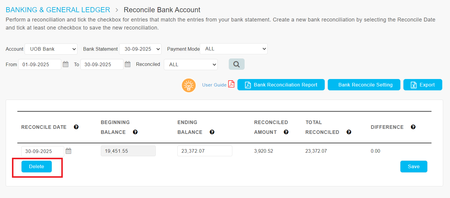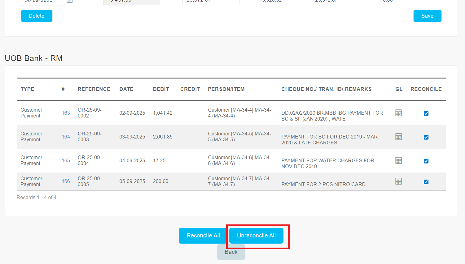 • If there are existing reconciled transactions, you have to first untick every checkbox (e.g. by clicking “Unreconcile All” button) under this reconciliation date. Extend the “From” date at the filter to ensure all previously reconciled transactions are covered.