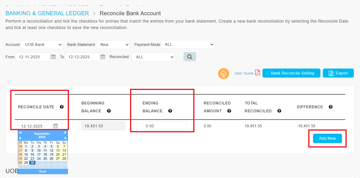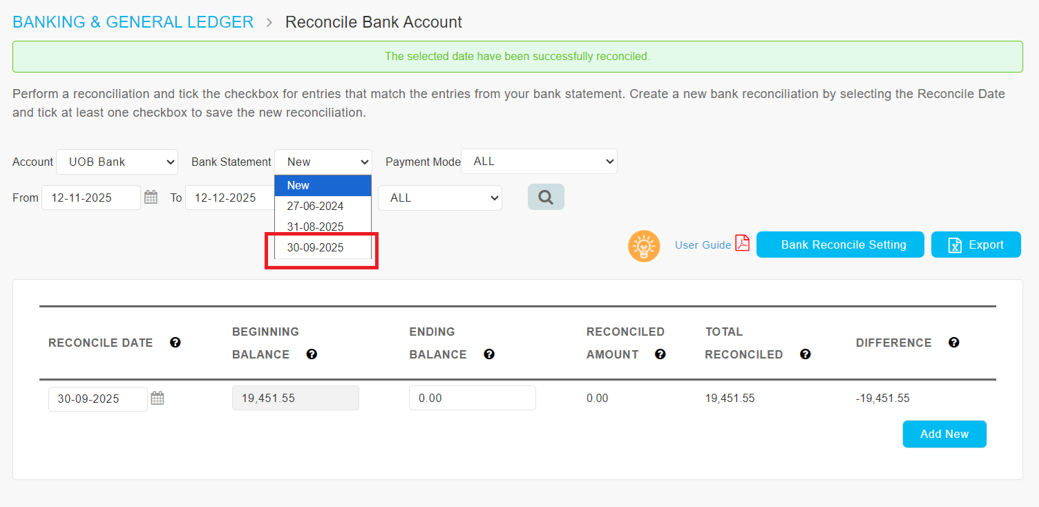 Next, click the “Add New” button to create or save a new bank reconciliation.