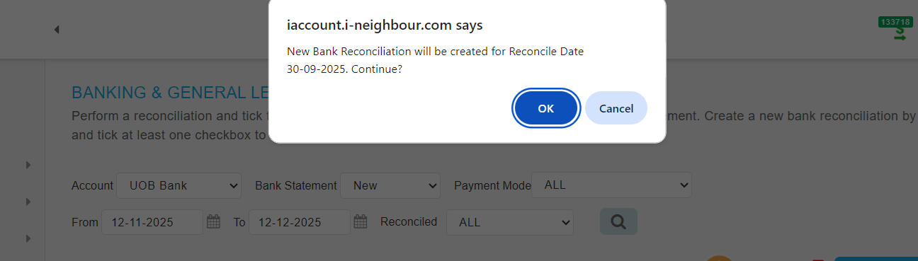 4. Click “Ok” to proceed with addition of new bank reconciliation.