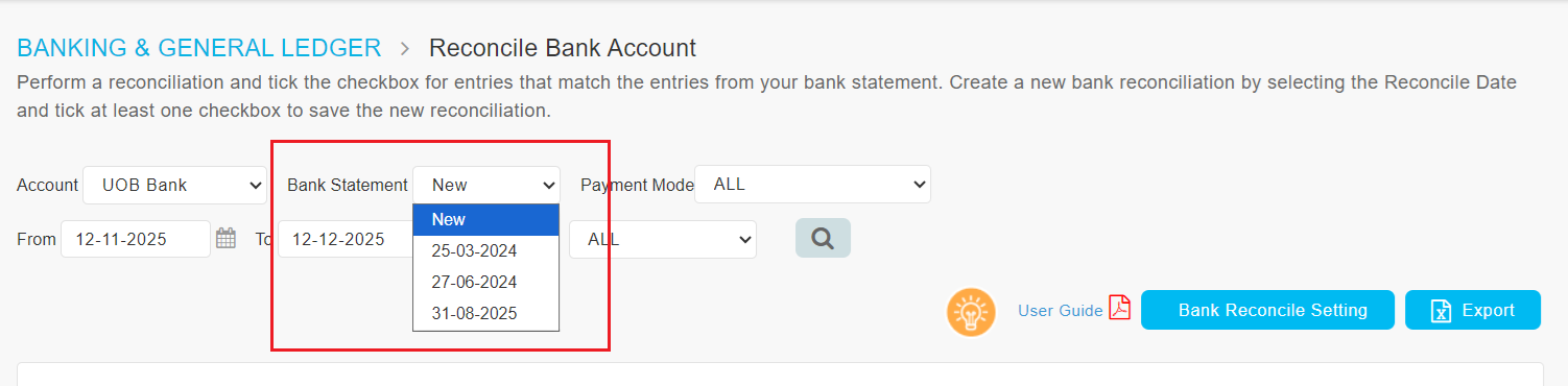 5. Next, select the newly added reconciliation date from the Bank Statement dropdown.