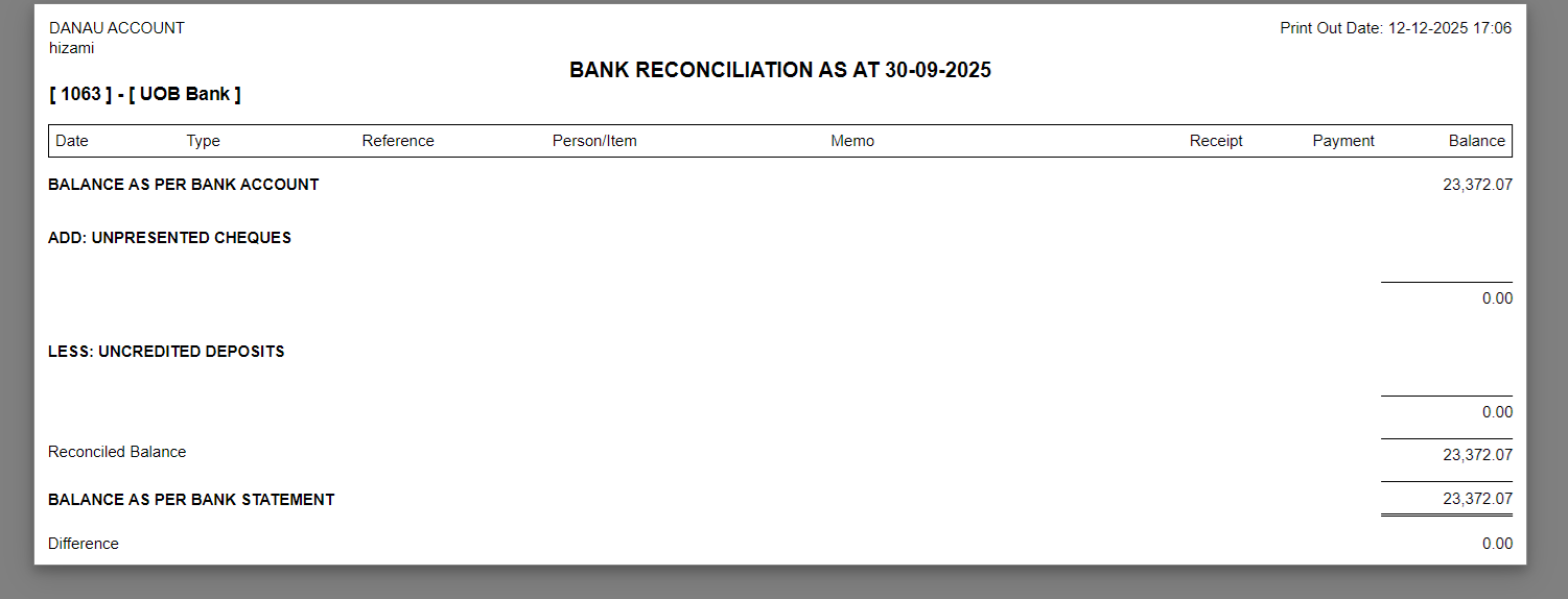 Reconciled Amount). This should be 0.00 when the reconciliation is correct. |