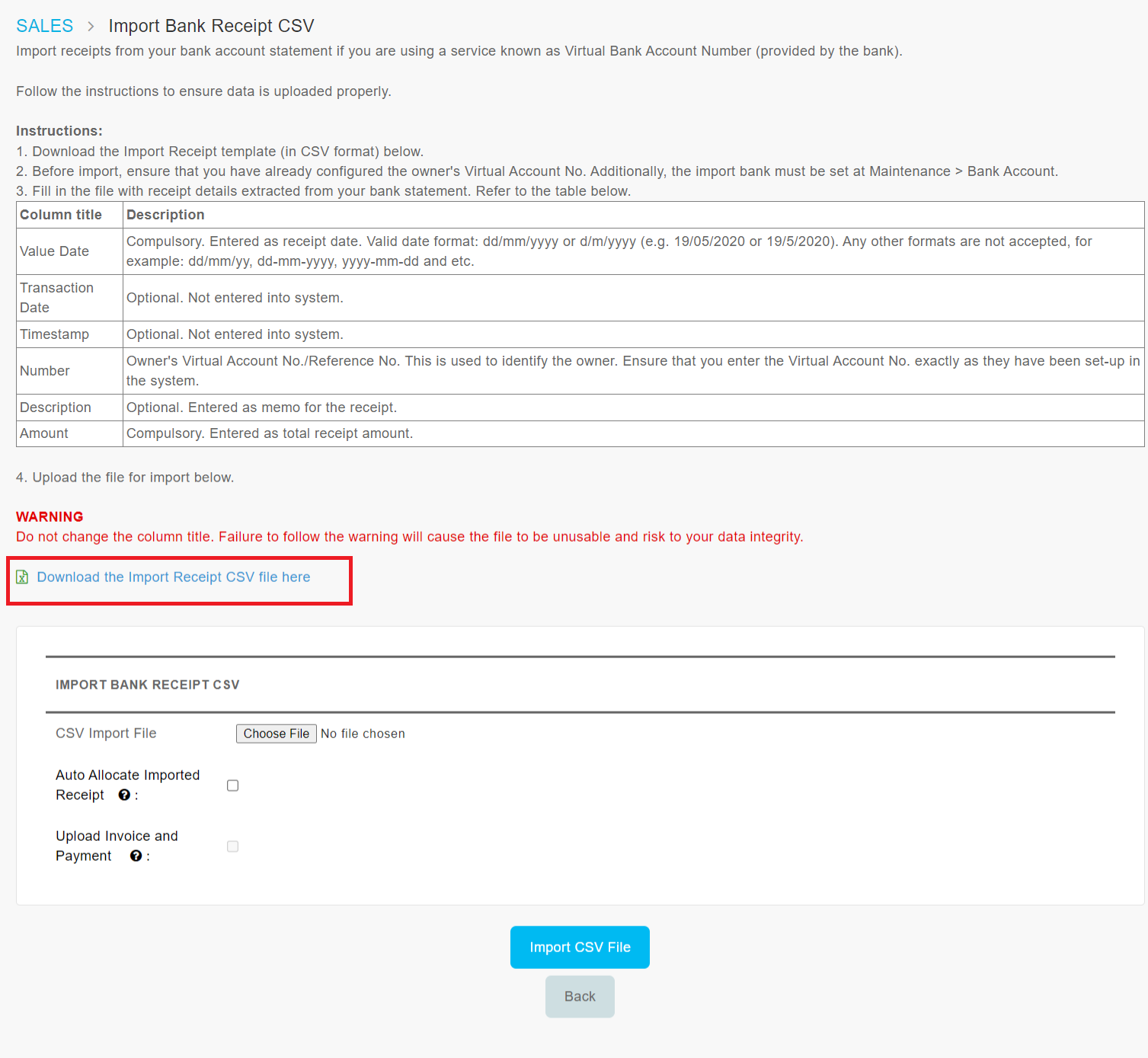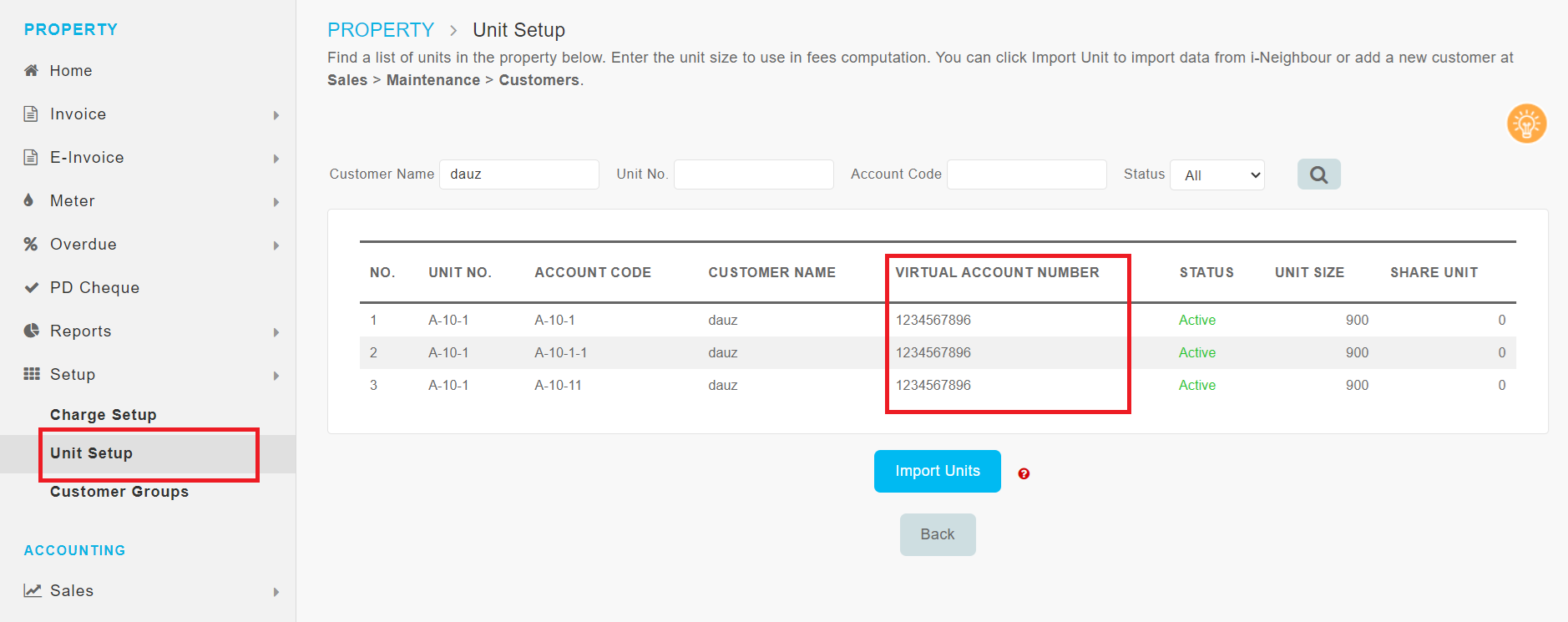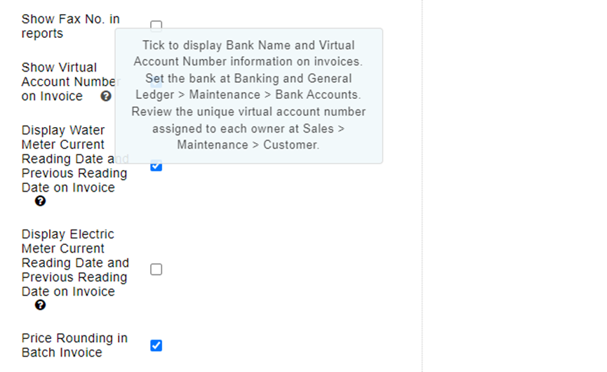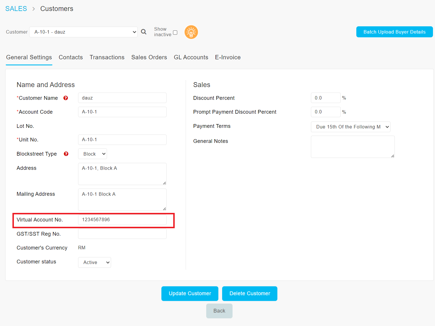 Setup page, the Virtual Account Number is also displayed at Sales > Maintenance > Customer page.