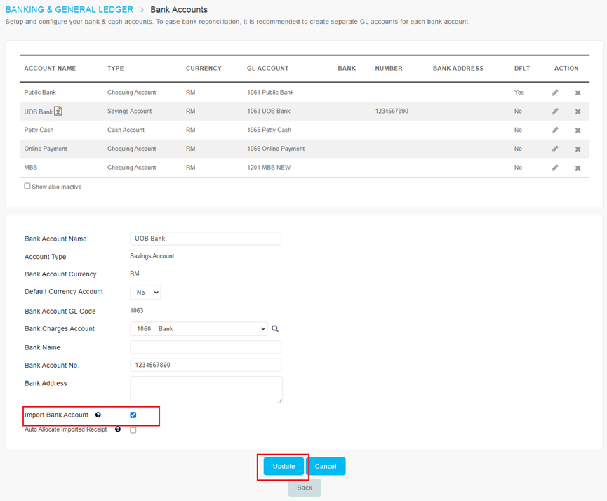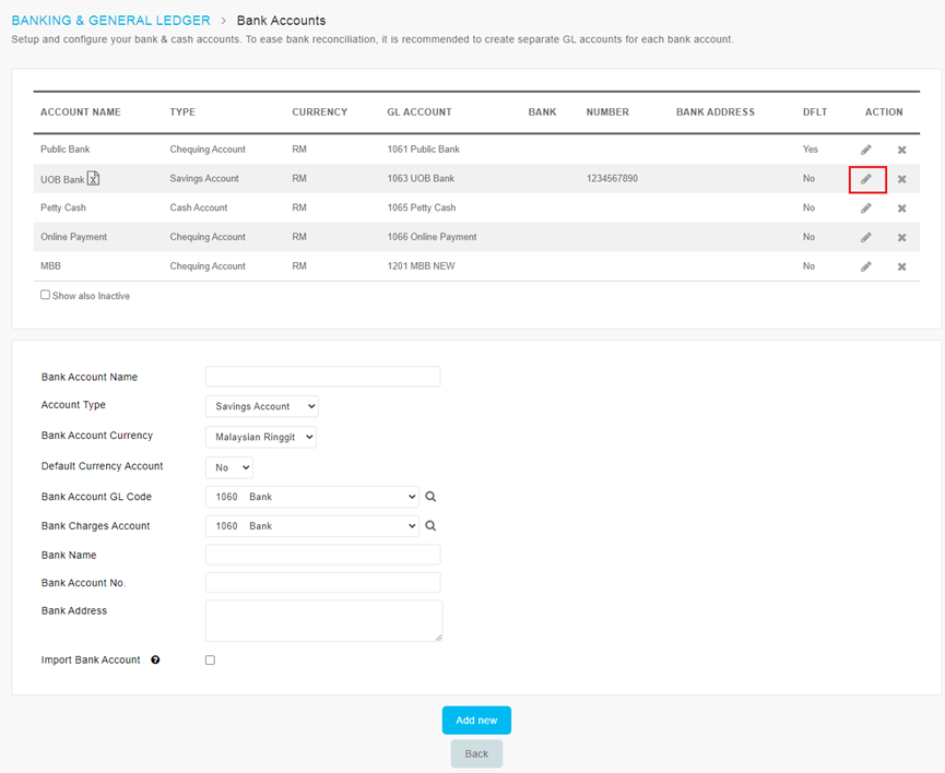 General Ledger > Maintenance > Bank Accounts. Select the relevant bank account to be set as the bank with Virtual Account