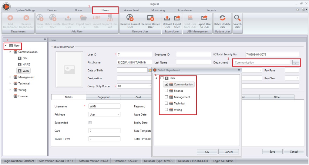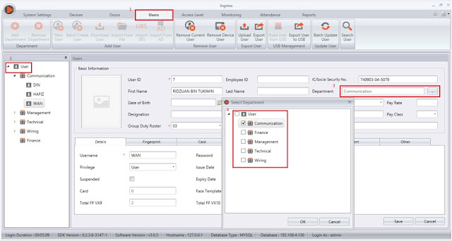 Click User > Select or sort user by Department or sub department > Select the preferred User ID.