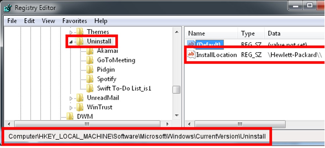 3. A registry editor application will be running and showing.4. Go to the location HKLM\SOFTWARE\Microsoft\Windows\CurrentVersion\Uninstall\ and find the value name InstallLocation containing the string "\Hewlett-Packard\\" then just delete this value.