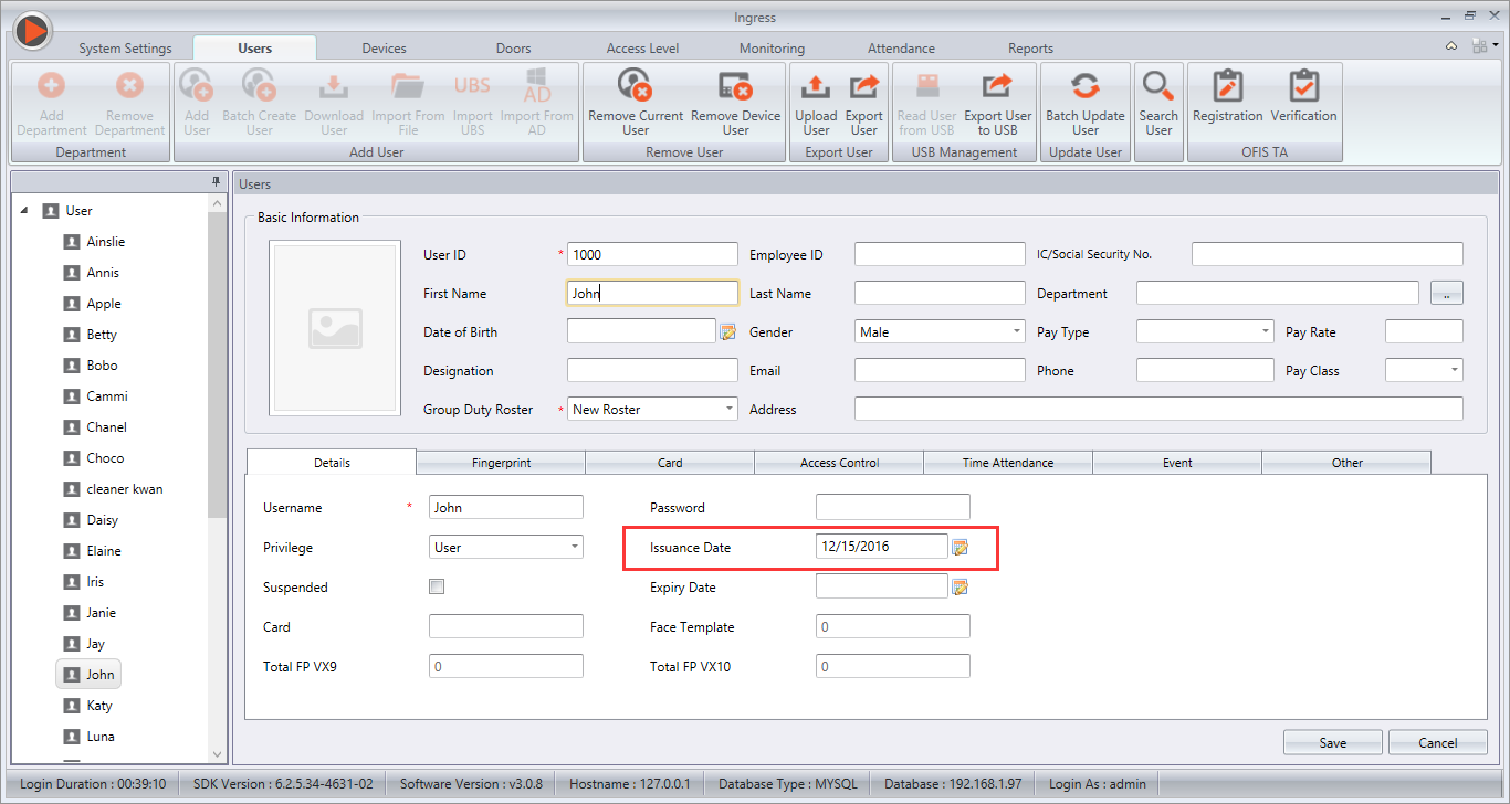 It is important to check the Issuance Date of the user. The user attendance sheet will not appear if the issuance date is set before the current date.