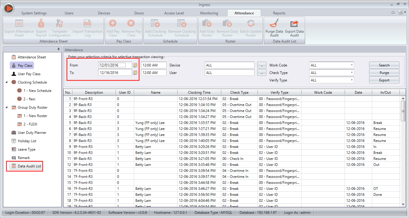 The transactions downloaded from the devices into Ingress will be listed in the Data Audit List. You could also check your transaction data from the Attendance tab > Data Audit List. Please make sure to select the correct date range when doing the troubleshooting. Check whether the data is already exist in the data audit list of the software.