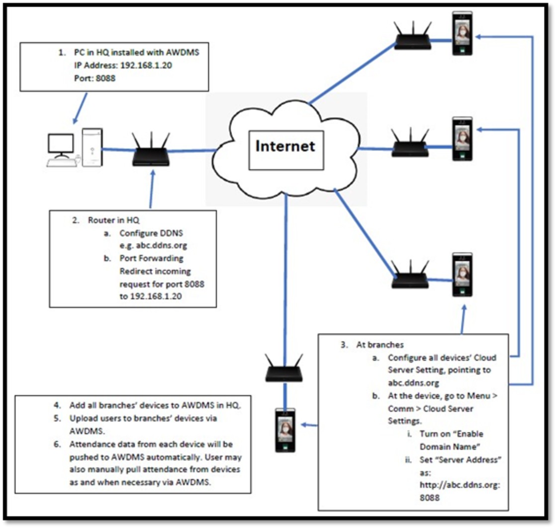b) Connect the device to the AWDMS server (Main HQ PC) by pointing it to the DDNS URL ( ex: abc.ddns.org)