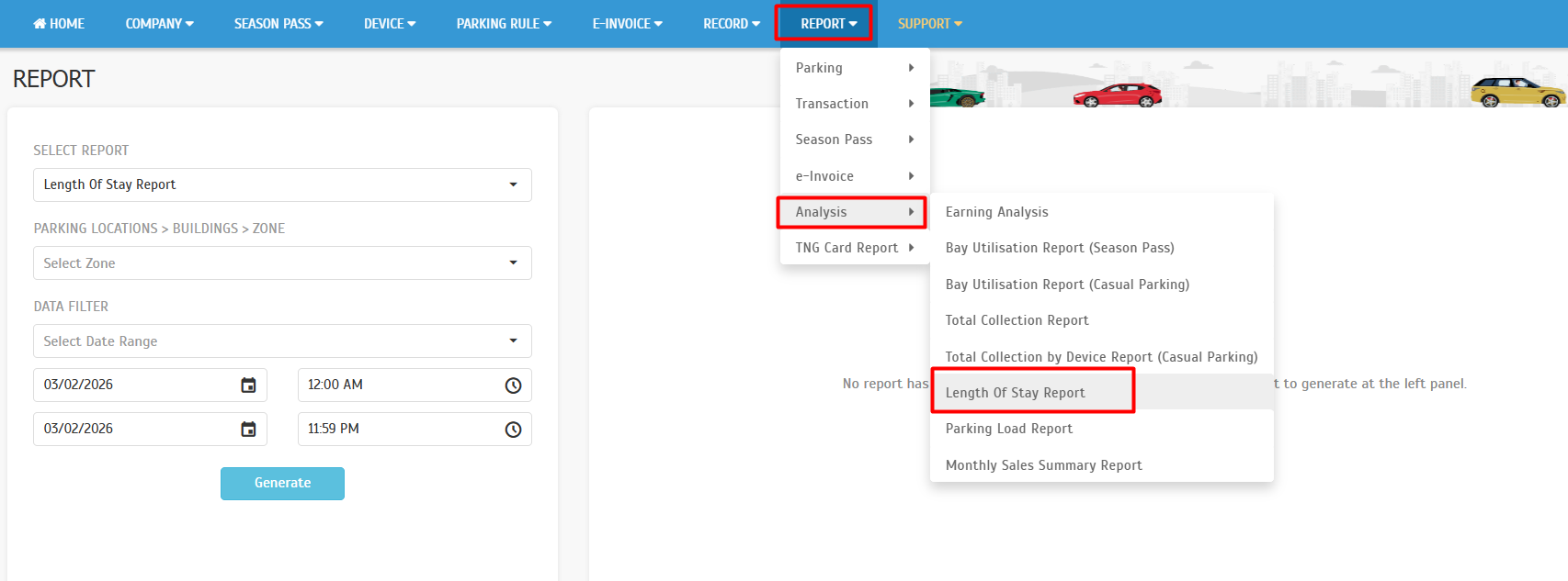 1. Login TimeTec Parking System, go to Report > Analysis > Length of Stay Report > filter date range and click Generate