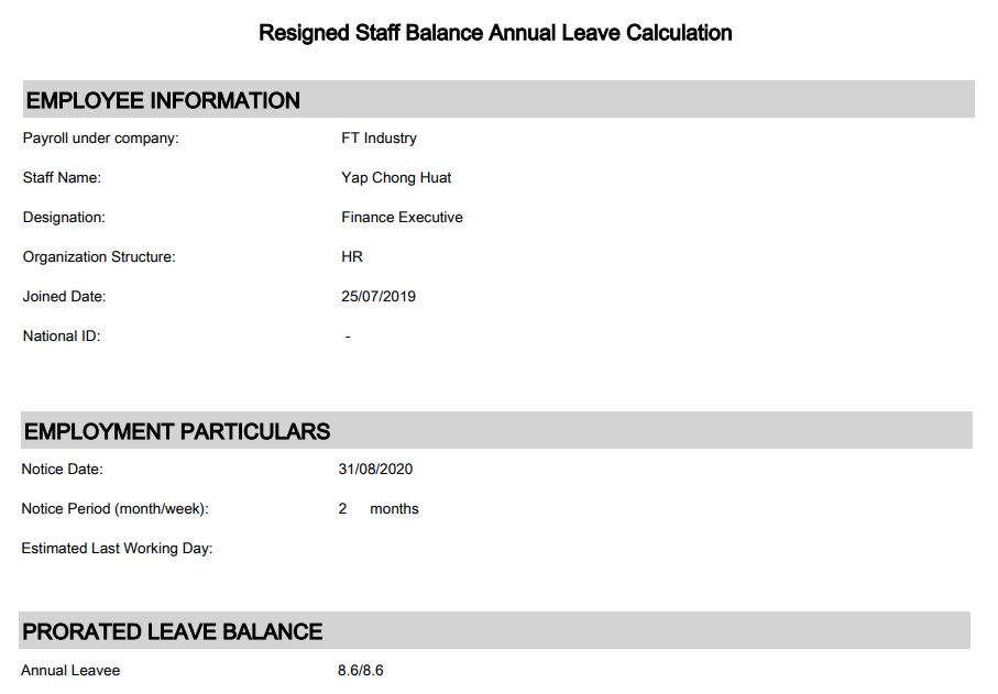 7. Report of Resigned Staff Balance Annual Leave Calculation sample: