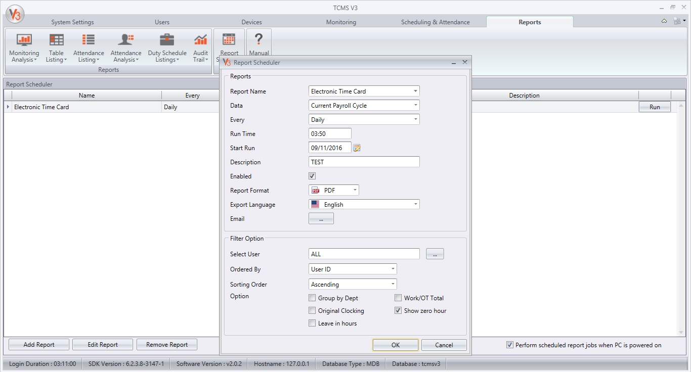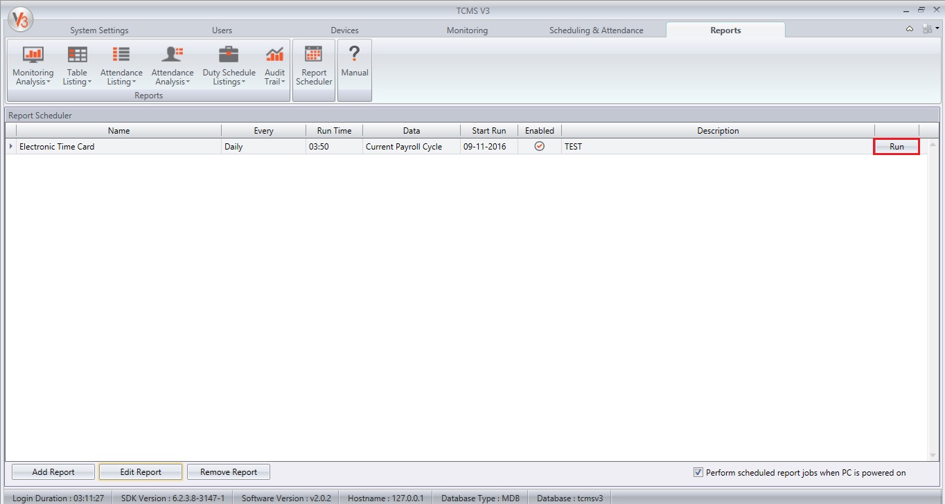 4) TCMS V3 will send two reports for the first time. First report - when you click the run button. Second report – the times that you have configured in the report scheduler settings. TCMS V3 will generate the reports at the report folder before sending the email to you.Report folder - C:\Program Files (x86)\FingerTec\FingerTec TCMS V3\TCMS V3\reports.