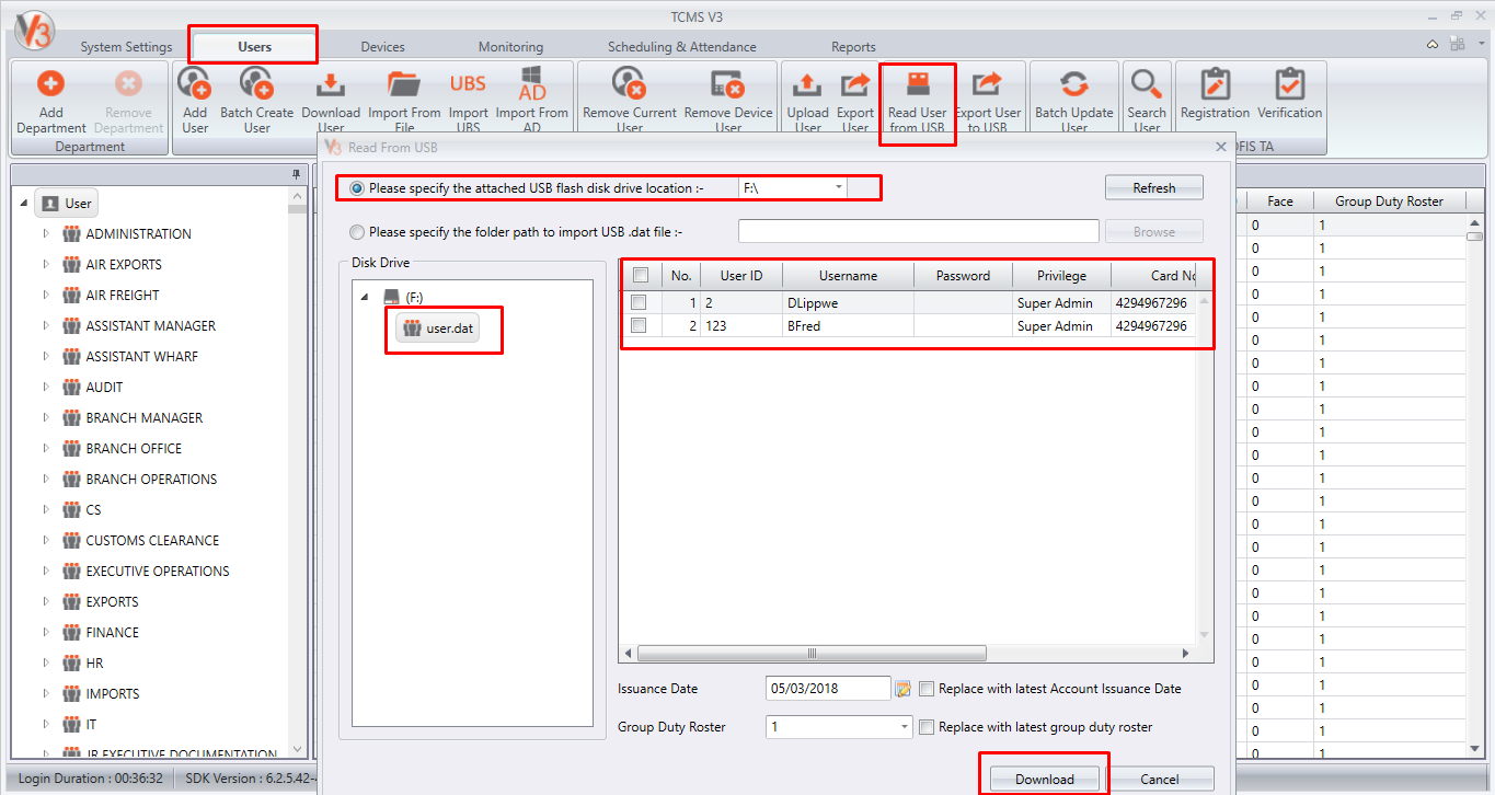 Go to Users > Click on Read User from USB. Select the USB flash disk location > Click From USB > Select the user.dat file and click Download.Step 3: