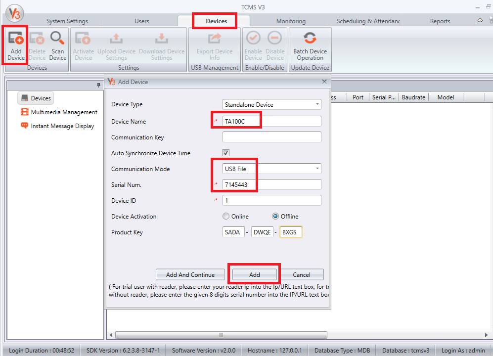 Go to Devices > Add Device > Insert Device Name > Select USB under Communication Mode > Insert the terminal's Serial Num. and Device ID > Select Offline under Device Activation > Insert the Product Key > Click Add.