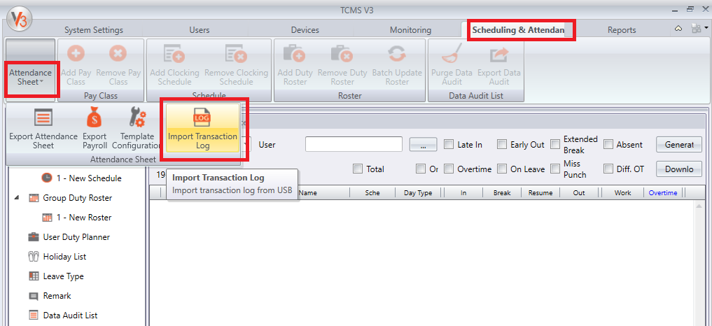 Plug the USB flash disk into the PC. Go to Scheduling & Attendance > Click on Attendance Sheet > Import Transaction Log.Step 2: