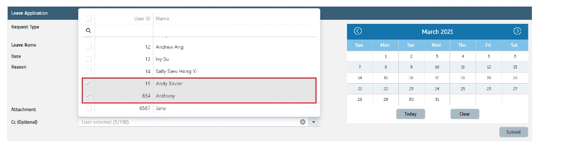 When applying leave, the user will be able to see the compulsory CC field recipient and it cannot be unchecked.