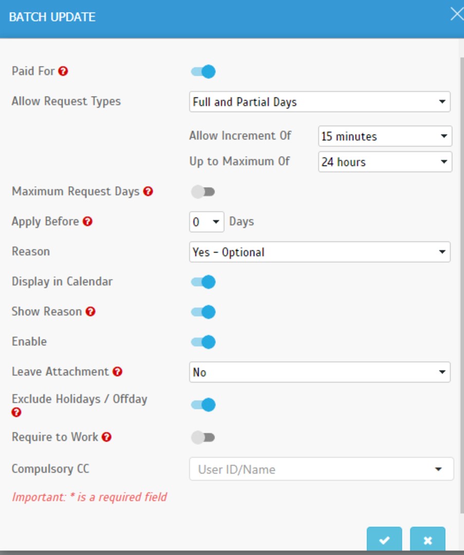 Aside from adding the Compulsory CC in a new Leave Type, the existing leave type can also be updated by batch to include this setting.