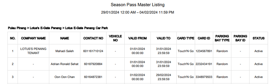 13. Season Pass Master Listing Report: This report provides detailed information about season passes, including their 'Valid From' and 'Valid To' dates.