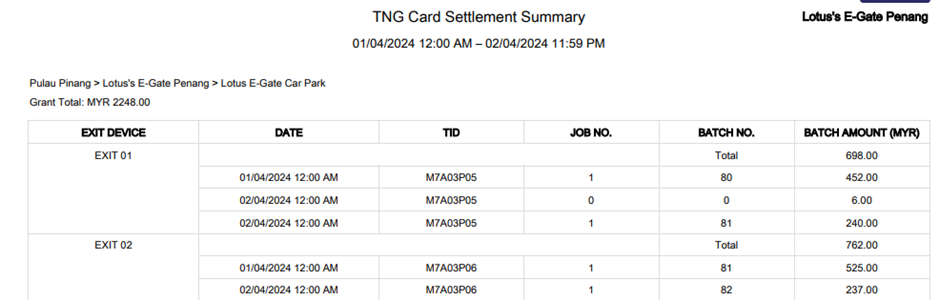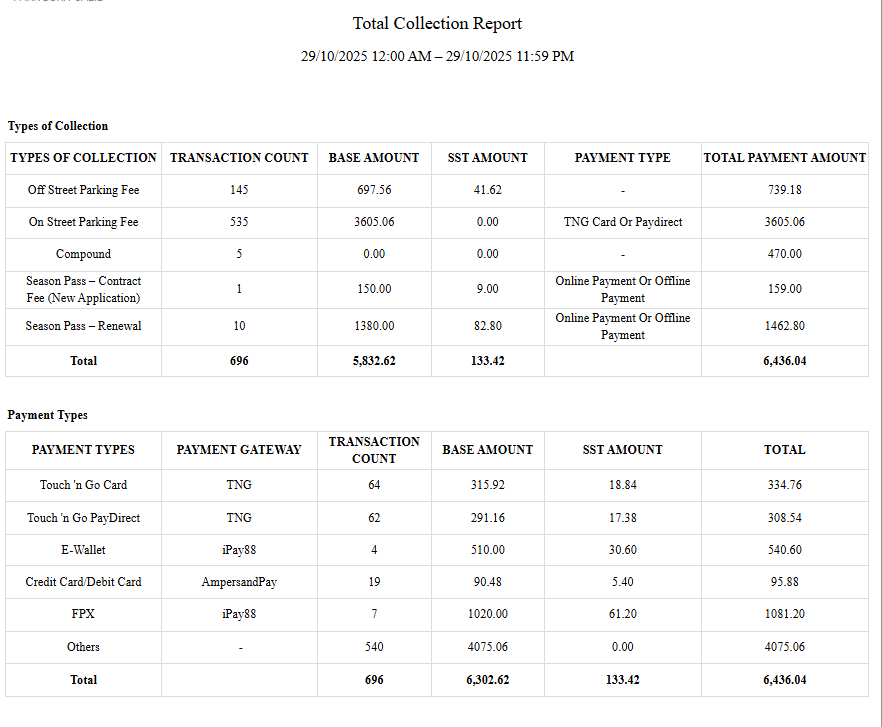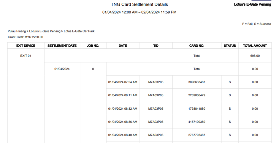 3. Validation Report: Provides information related to the Card(TNG/EMV) validation of parking transactions. This includes validation codes, user information, entry and exit locations, as well as details on the actual parking amount and any discounted amounts applied