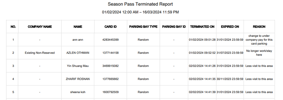 10. Season Pass Terminated Report - This report displays information regarding terminated season passes, including details such as the pass holder's name, pass ID, reason for termination, termination date, and any relevant notes or remarks.