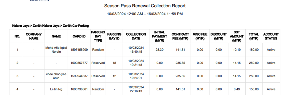 12. Season Pass Renewal Collection Report - This report includes information such as the pass holder's name, pass ID, renewal date, amount paid, and renewal status. It helps management track the progress of season pass renewals and monitor revenue collection