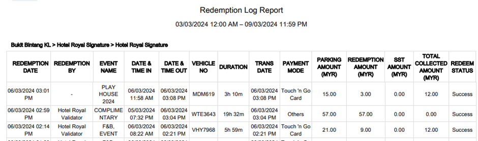 5. Redemption Log Report: Provides information related to the LPR validation of parking transactions. This includes validation codes, user information, entry and exit locations, as well as details on the actual parking amount and any discounted amounts applied.