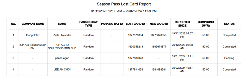 7. Season Pass Transaction Listing: Provides information on season parking payments, including user and vehicle information.