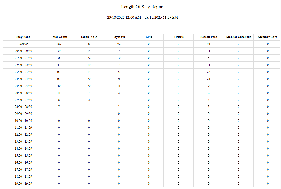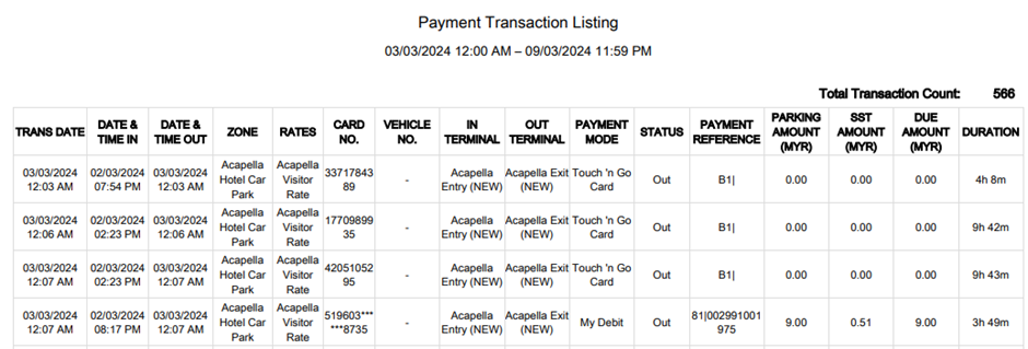 6. Payment Transaction Listing: Provides information on casual parking payments, including entry and exit records of vehicles, along with details on parking duration and fee amounts.