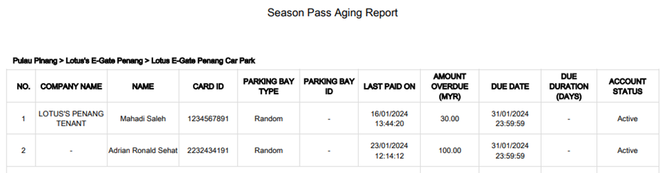 15. Season Pass Aging Report: This report is designed to identify customers who are yet to renew or are overdue.