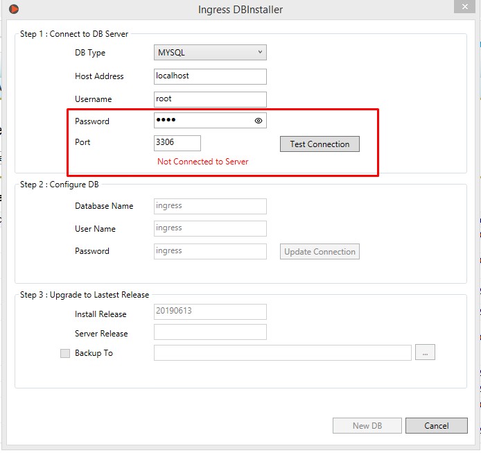 1. The Ingress DB Installer is showing an error message stating ‘Not Connected to Server’ when you run the installation at the first step (Test Connection).Solution:This error appears because you have keyed in the wrong MySQL password. Make sure the MySQL password is the one you created when you first install the MySQL server 5.5 in your PC.However, if you have forgotten the password, you may refer to the solution from the MySQL vendor website on how to reset the MySQL password. You can also ask your programmer or the IT personnel to configure the steps for you, as you might need help from the IT expertise in regards to this configuration.Refer to http://dev.mysql.com/doc/refman/5.7/en/resetting-permissions.htmlAnother option to reset this password is by uninstalling the MySQL server and reinstall it with a new one. However, this option will corrupt the existing database after you decide to reinstall the MySQL. Unless you have a backup database file where you can restore the existing file after reinstalling the program.2. Error ‘Failed to upgrade database’ at the third step (Upgrade Database)