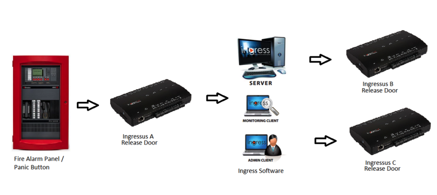 IntroductionA fire alarm system is a variety of devices connected together to identify and alert people through visual and audio appliances when smoke, fire, carbon monoxide gas or other emergency situations are present. These alarms might be triggered from heat detectors and smoke detectors. The fire alarm system consists of a control panel, which is connected to the smoke detectors, emergency break glass devices, heat detectors, LED flashers, water sprinklers, alarms, FingerTec door access controller and etc. If there is any fire activity present, the smoke detector and the heat detector will set off the LED flashers, water sprinklers and alarms within the premises simultaneously. You can either use the emergency break glass device or the FingerTec terminal to unlock all the doors and proceed to the evacuation assembly spot.BenefitsOn Fire Alarm Panel, there is output relay to control a variety of functions such as Switching fans/Air Conditioning on or off and Closing/opening doors. By using just the same relay signal from the Fire Alarm Panel, which is connected to a FingerTec Ingressus controller, it is able to trigger other Ingressus controllers to open doors. Thus, you do not need to do wiring from Fire Alarm Panel to all Ingressus controllers or do many settings on Ingress. During an emergency triggered on Fire Alarm Panel, the relay will send a signal to one of the Ingressus controllers. Then Ingress that manages all the Ingressus controllers will receive this signal and command other Ingressus controllers to open doors too.Process1. Add and activate Ingressus Controller on Ingress on Device tab2. Add a Fire Alarm Zone and add setting into 1 unit selected Ingressus which connected to Fire Alarm Panel output signal