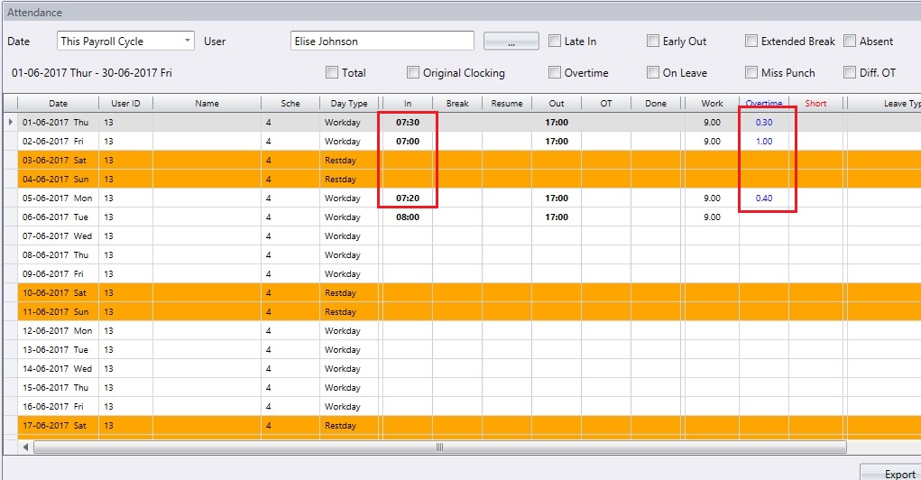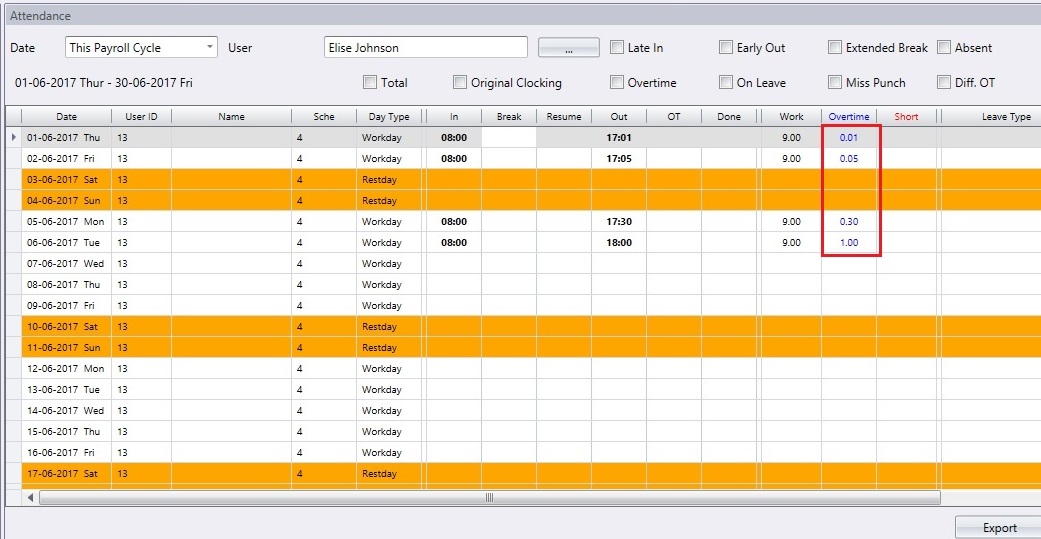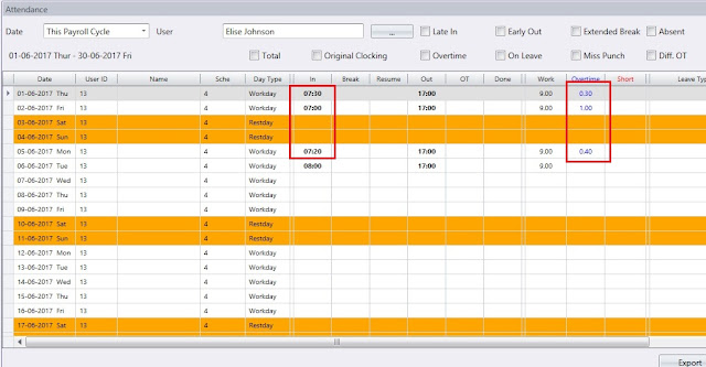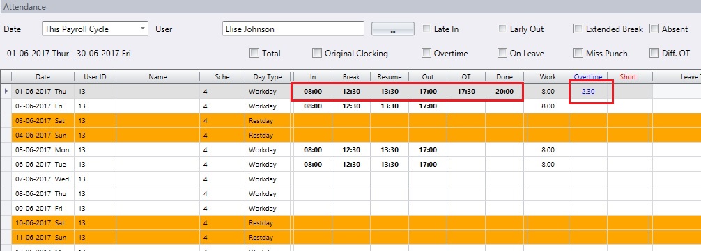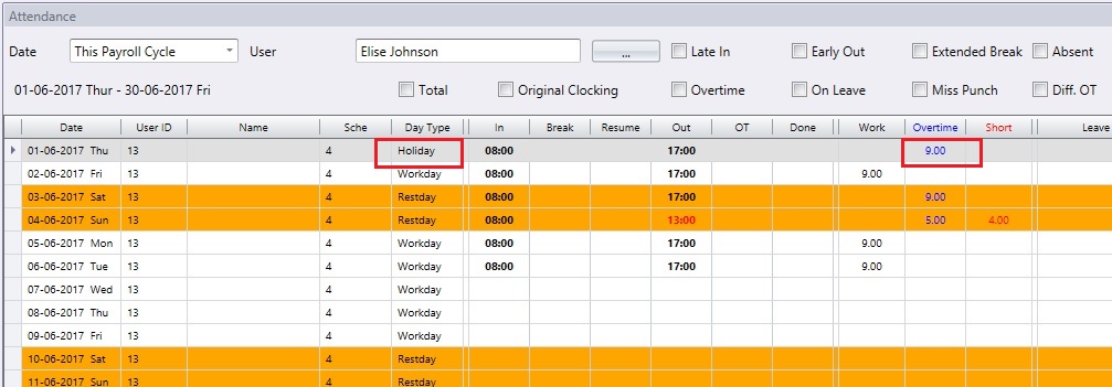 Further, you will notice that once a user performs clocking on a rest day/off day, in addition to Overtime being computed, if the user works less than the defined Out time, the system will also calculate it as Short.