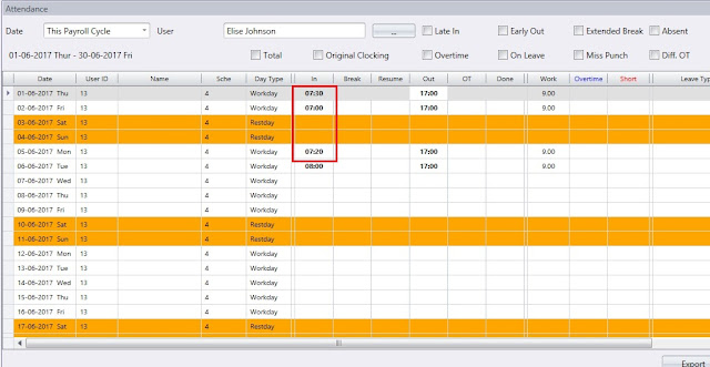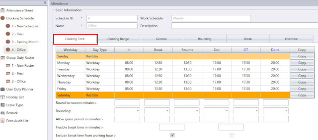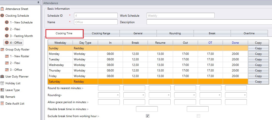 Example:The working schedule is IN = 08:00 and OUT = 17:00Using a weekly schedule, key in the times for work days and rest days/off days (e.g. Saturday and Sunday). If you do not fill in the clocking slots for rest days/off days, clocking times on those days will not be calculated.