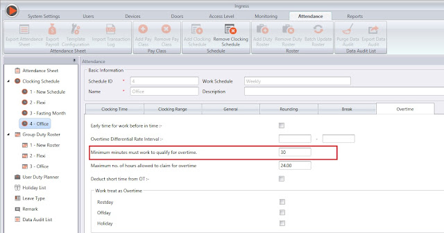 Without configuring Minimum minutes must work to qualify for overtime, the system will calculate overtime immediately after the defined OUT time. Based on the example, the system will then start to calculate overtime at 17:01 onwards as shown below.If you change the highlighted setting to 30 minutes, the system will then only calculate overtime 30 minutes after the defined OUT time. As per the example below, the system will calculate overtime only if the user works until at least 17:30.