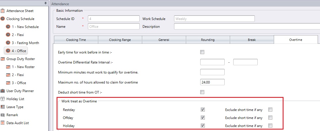 Work Treat as Overtime – Restday, Offday, Holiday (Weekly/ Daily/ Flexi)