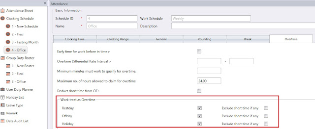 At Overtime tab > check the box for ‘Work treat as Overtime’ for Restday, Offday and Holiday.