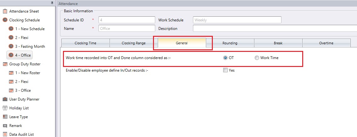 Go to Attendance > Clocking Schedule > General. By default, Work time recorded into OT and Done column considered as is set to OT.